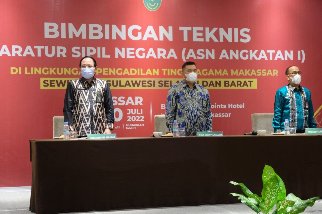 www.pta-makassar.go.id - Pengadilan Tinggi Agama Makassar menyelenggarakan Bimbingan Teknis Aparatur Sipil Negara (ASN) Angkatan I Tahun 2022 di lingkungan Pengadilan Tinggi Agama Makassar Sewilayah Sulawesi Selatan Barat, bertempat di Hotel Four Points by Sheraton Makassar, mulai tanggal 28 s/d 30 Juli 2022.  Acara tersebut diikuti sebanyak 105 orang peserta dari Bidang Kesekretariatan Pengadilan Agama di lingkungan PTA Makassar Sewilayah Sulawesi Selatan dan Barat serta dihadiri pula peserta dari Dinas Pemda Provinsi Sulawesi Selatan Barat dengan menghadirkan narasumber dari Instansi KPPN Makassar II, BKN, Kanwil DJKN/KPKNL serta Dinas Perpustakaan dan Kearsipan Daerah Provinsi Sulawesi Selatan.
