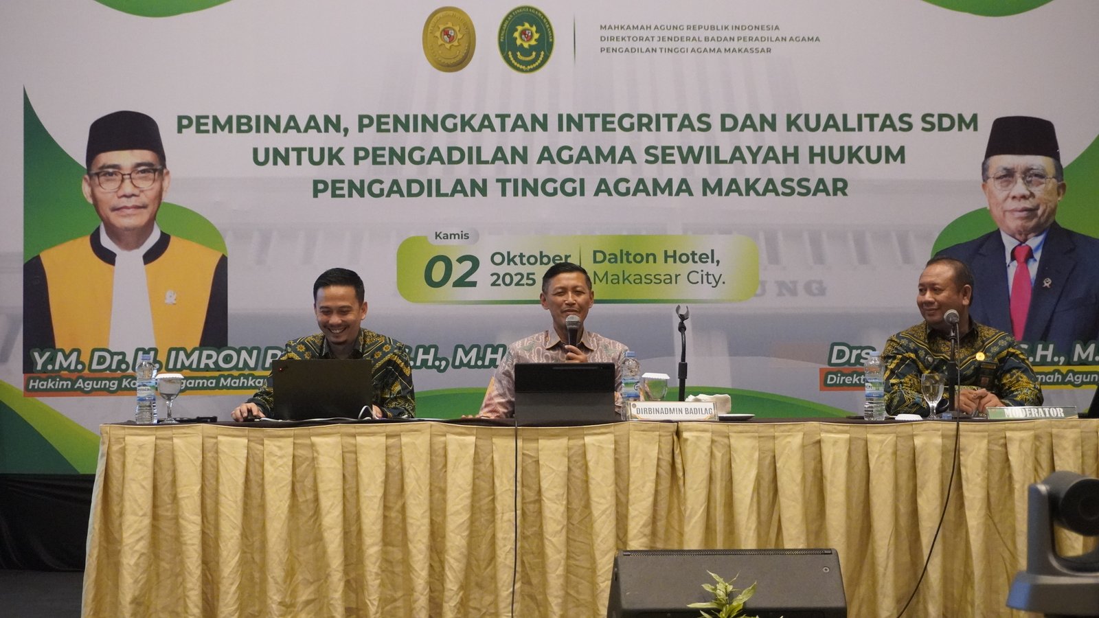 Direktorat Jenderal Badan Peradilan Agama (Badilag) menyelenggarakan kegiatan Pembinaan, Peningkatan Integritas dan Kualitas Sumber Daya Manusia untuk seluruh Pengadilan Agama se-Wilayah Hukum Pengadilan Tinggi Agama (PTA) Makassar. Pembinaan langsung diberikan oleh Hakim Agung Kamar Agama Mahkamah Agung RI Dr. Imron Rosyadi, S.H., M.H., Direktur Jenderal Badan Peradilan Agama Drs. H. Muchlis, M.H., dan Direktur Pembinaan Administrasi Peradilan Agama Sutarno, S.I.P., M.M.