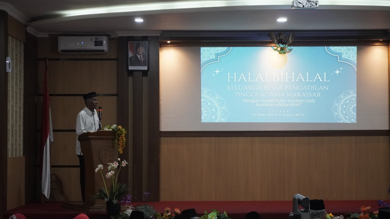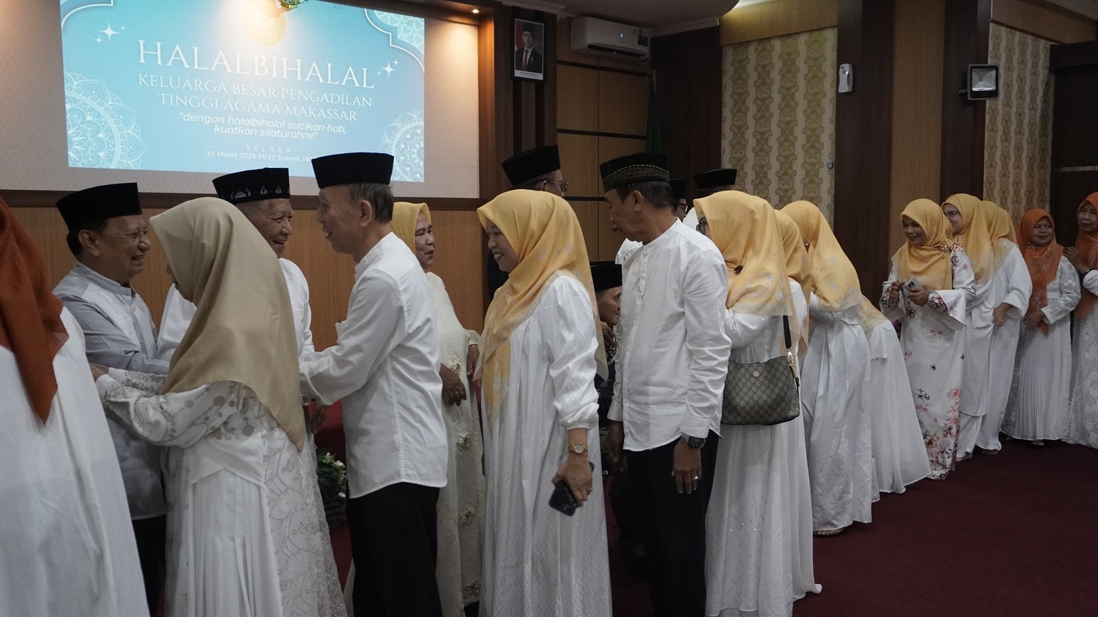 Pengadilan Tinggi Agama (PTA) Makassar menggelar kegiatan Halal Bihalal Keluarga Besar PTA Makassar pada Selasa, 31 Maret 2026, bertempat di Aula PTA Makassar. Kegiatan yang sarat makna spiritual dan kekeluargaan ini diikuti oleh Ketua dan Wakil Ketua PTA Makassar, para Hakim Tinggi, pejabat struktural dan fungsional, serta seluruh aparatur PTA Makassar. Turut hadir pula Ketua dan Anggota Dharmayukti Karini (DyK) Cabang Sulawesi Selatan, Penasihat Ikatan Purnabakti Peradilan Agama (IPPA) Dr. H. Andi Syamsu Alam, S.H., M.H., Ketua IPPA Dr. Drs. H. Abu Hurairah, M.H., Ketua Ikatan Purnabakti PTA Makassar Dr. Hj. Ummi Salam, M.H., serta para purnabakti Peradilan Agama. Suasana aula dipenuhi kehangatan kekeluargaan yang mencerminkan eratnya hubungan antargenerasi insan peradilan agama.