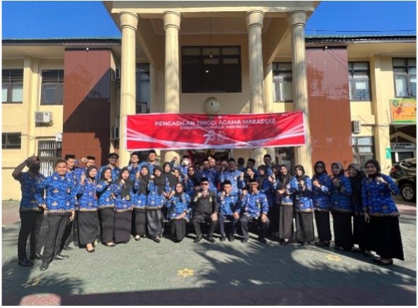 Aparatur PTA Makassar mengenakan Pakaian Sipil Lengkap bagi Pimpinan dan Hakim Tinggi, sedangkan yang lainnya mengenakan Pakaian Korpri.